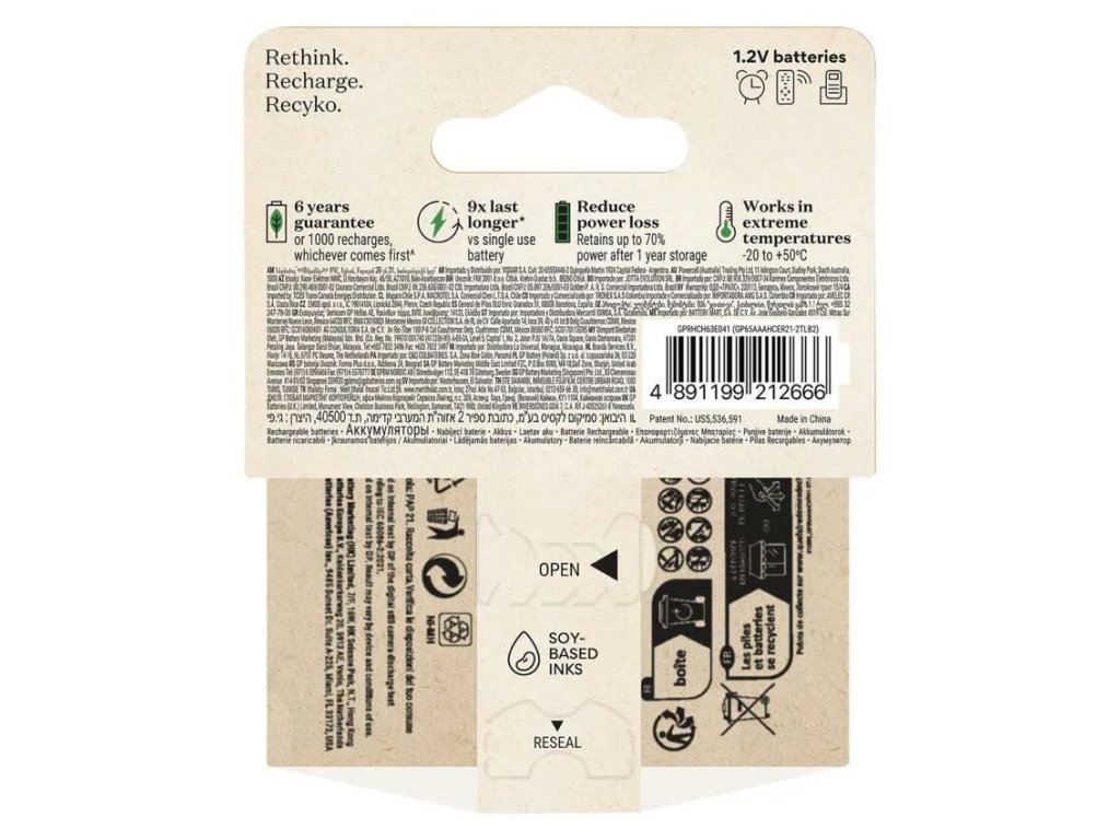 Baterie řady ReCyko od GP Batteries jsou symbolem nejmodernější technologie koncentrované energie. Vysoká kapacita v kombinaci s účinnou ochranou proti samovybíjení znamená jistotu energie připravené k vašemu bezprostřednímu použití. Pyšní se prodlouženou životností na více než 300 nabíjecích cyklů a až 80 % uchované kapacity i po 1 roce od nabití. Minimální samovybíjení ve spojení s velkým výběr z kapacit včetně těch nejvyšších na trhu pro vás znamenají úsporu času i peněz. Vlastnosti baterií ReCyko jsou zárukou nalezení nejlepšího poměru mezi výkonem a pořizovacími a provozními náklady.