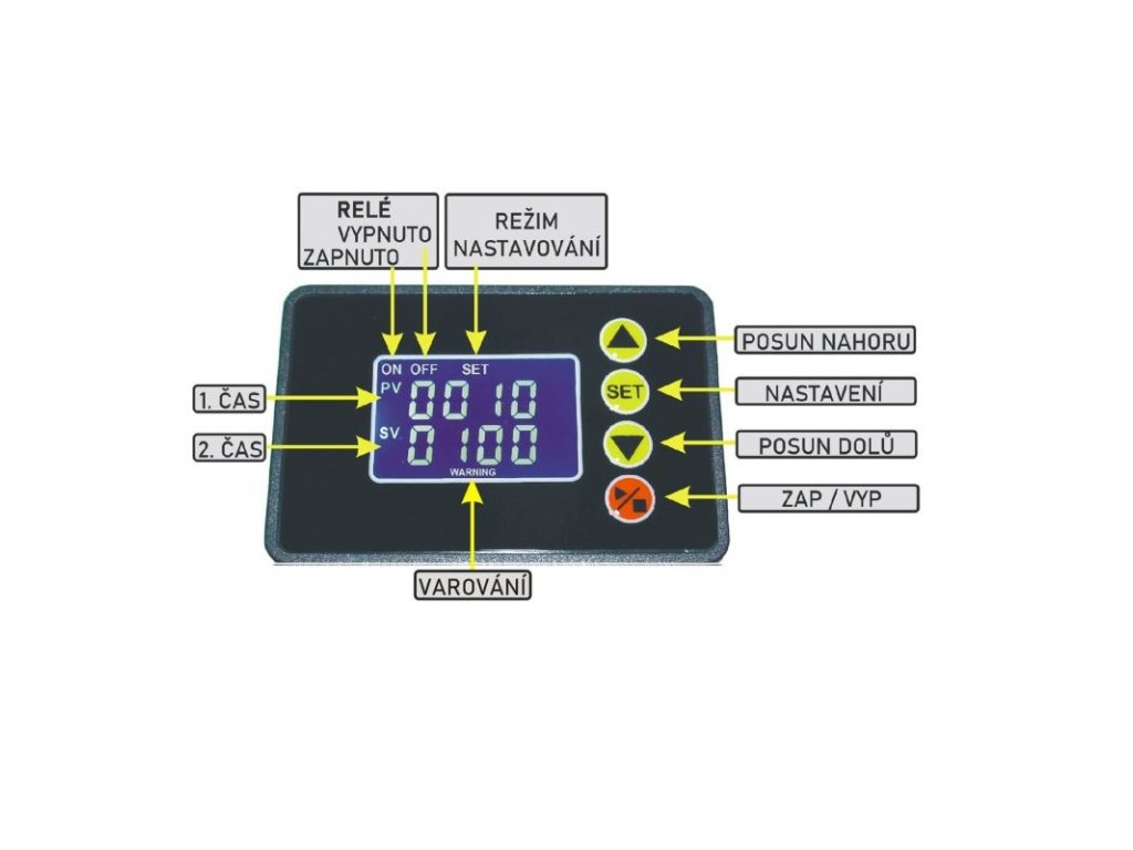 Rozsah časovače: 0001 až 9999 sekund ; 00:01 až 99:59 minut ; 01:00 až 99:00 hodin. Podrobné nastavení viz přiložený návod k obsluze.