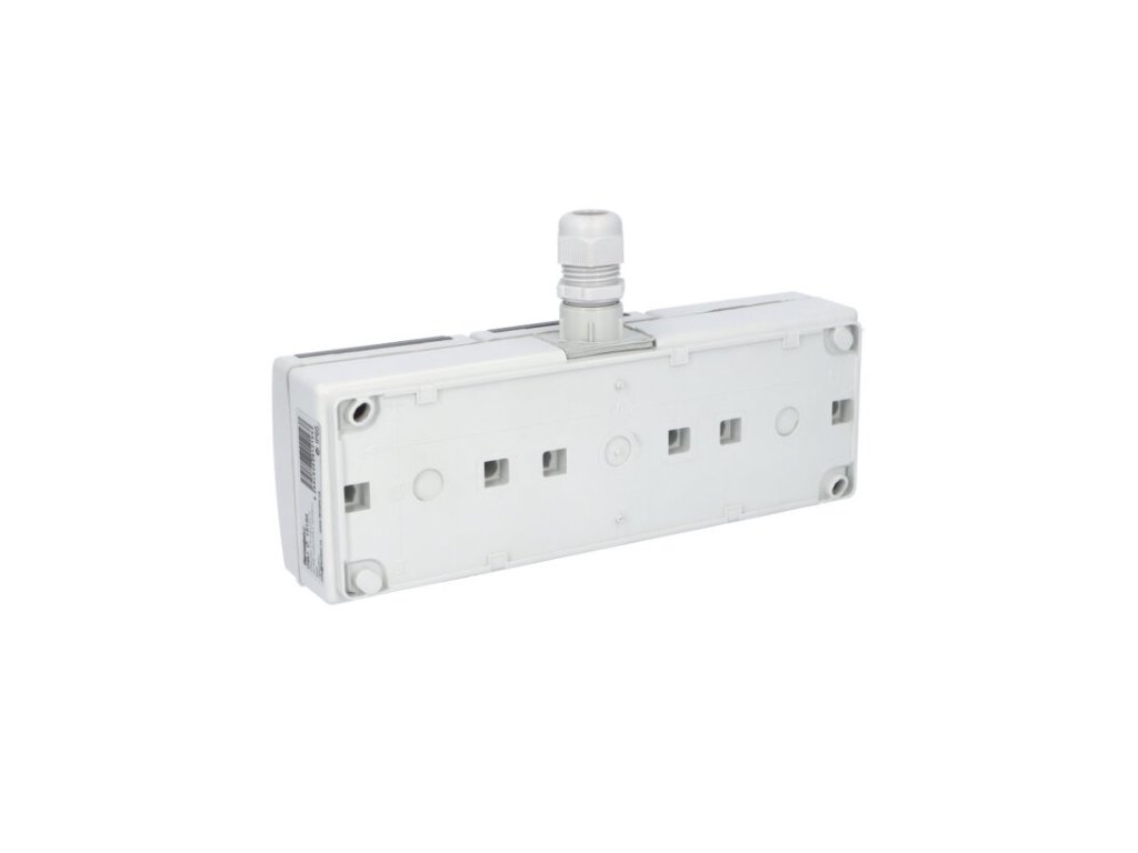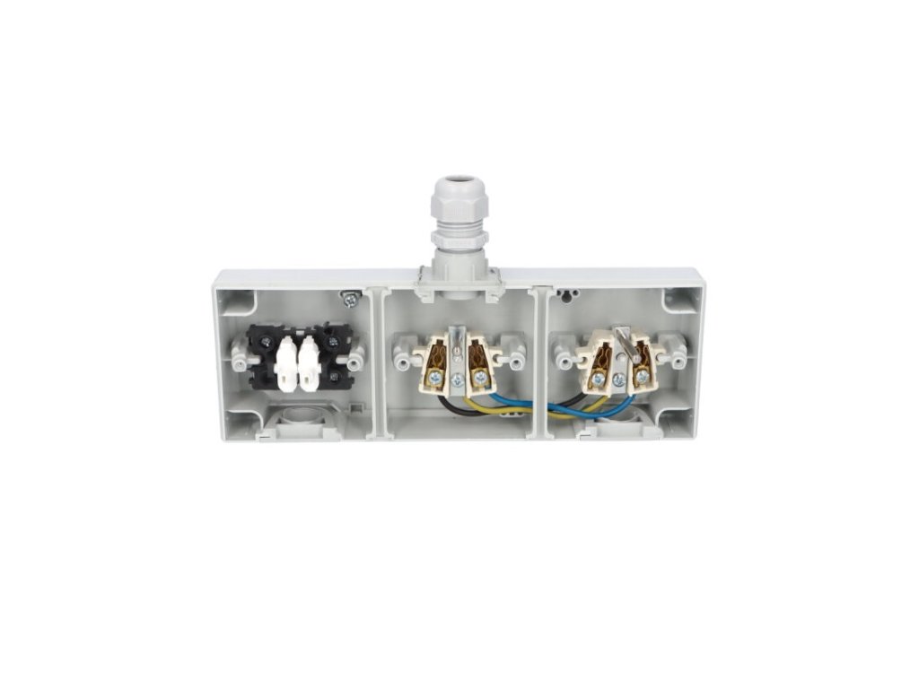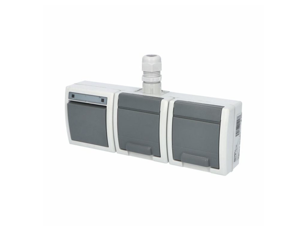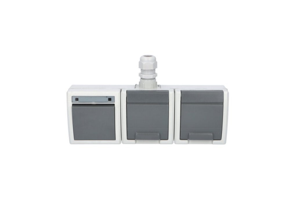 Venkovní dvojitá zásuvka v kombinaci s vypínačem č. 6 ve vyšším krytí Atlas IP65 se šroubovou vývodkou M20 pro kabely CYKY-J 3x1,5 až 5x2,5.