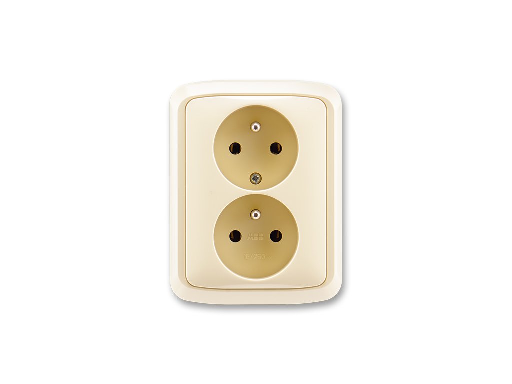 Dvojzásuvka ABB Tango 5512A-2349 C v barevném provedení slonová kost s ochrannými kolíky má stupeň krytí IP20, jmenovitý proud 16 A a napětí 250 V AC. Zásuvka je upevněna šrouby a má šroubové svorky pro vodiče 1,5 – 2,5 mm2. Dvojnásobná zásuvka Tango má řazení 2x (2P+PE).