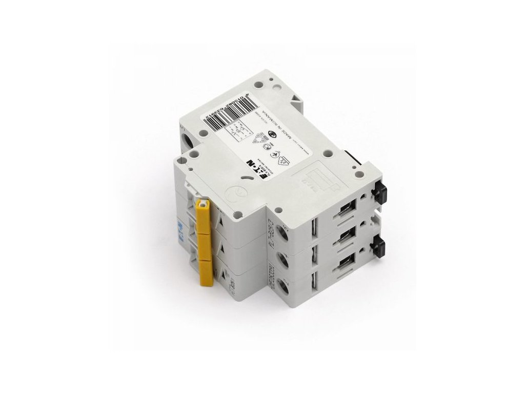 Jistič, jističe, 3 fázový, třífazový, třífázové, trojfázový, elektrický, elektro, zásuvkový, motorový, proudový, 3P, třípólový, trojpólový, na DIN lištu, do rozvaděče, hlavní, třímodulový, trojmodulový, slouží k ochraně elektrických obvodů proti přetížení a zkratu. Jističe Eaton jsou určeny pro nadproudovou ochranu elektrických vedení a zařízení nízkého napětí. Splňují požadavky norem ČSN EN 60898, příp. ČSN EN 60947-2