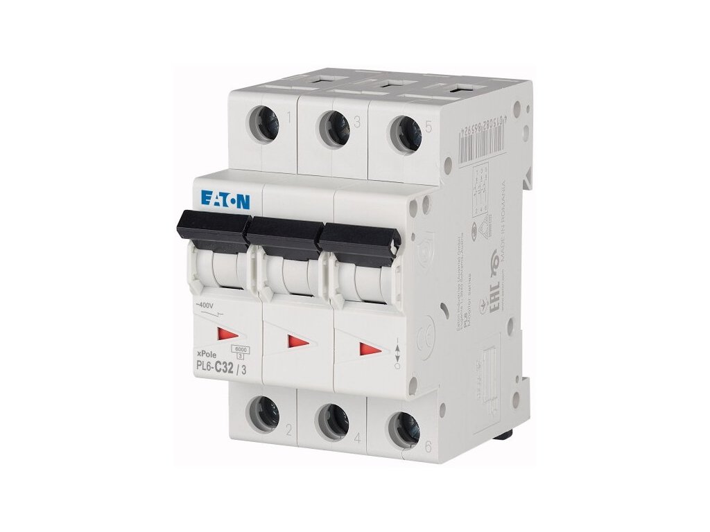 Třífázový jistič Eaton C32/3 řady PL6 pro domovní a průmyslové použití s vypínací schopností 6 kA s charakteristikou C. Uchycení jističe na DIN lištu v elektrickém rozvaděči je rychlé a jednoduché.
