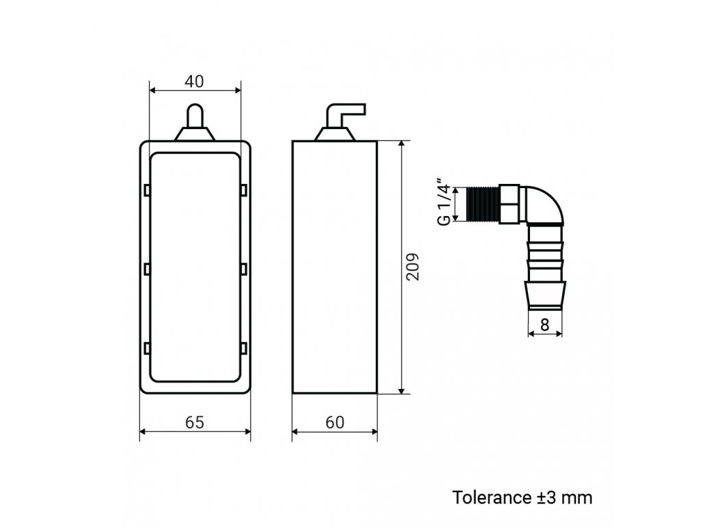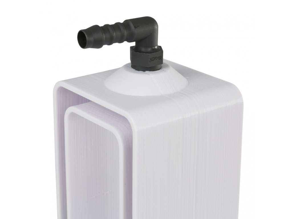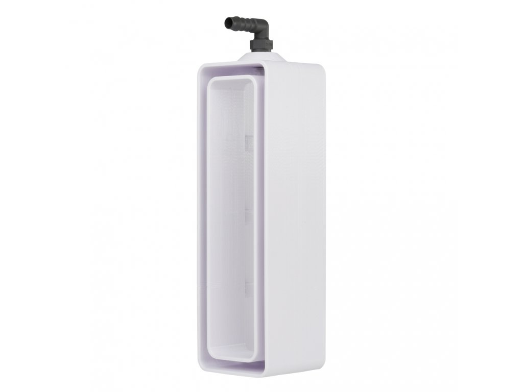 Tato jímka je pro odvod kondenzátu vybavena trubkovým závitem G 1/4”, který je možné napojit, při vhodném zredukování, na jakýkoliv odpadní systém. Pro usnadnění montáže je jímka dodávána s 90° kolenem, na které je možné připojit hadici s otvorem o průměru 8 mm. Kvalitní materiál s vysokou odolností vůči UV záření zajišťuje dlouhou životnost.