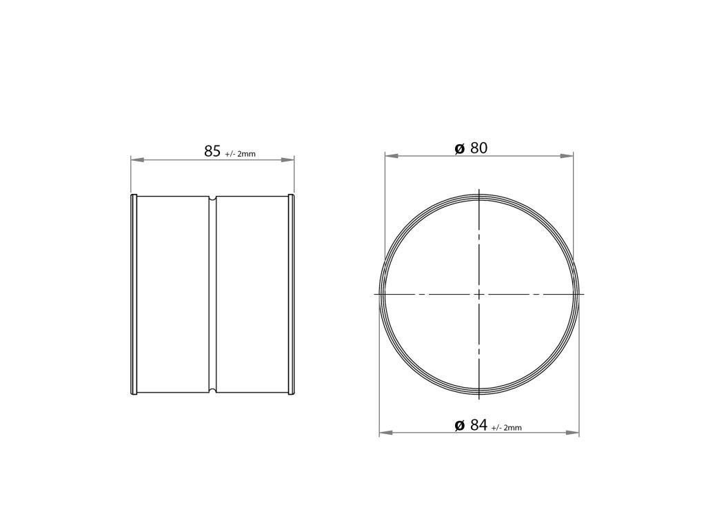 Kovová vnější spojka o průměru 80 mm se využívá k napojení komponentů (kolena, odbočky apod.). Spojka má dlouhodobou životnost. Její montáž je velice jednoduchá, bez použití složitého nářadí (spoje se do sebe jednoduše nastrčí). Vnější spojka je určena do teploty až 100 °C a je vyrobena z pozinkovaného plechu. Pro lepší těsnost spojů je možno dokoupit lepící pásku.