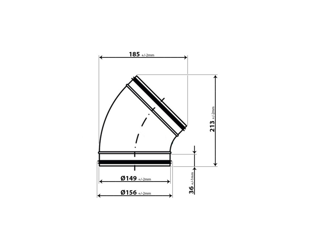 Kovové koleno pro kruhové potrubí 45 st./ 150 mm s těsnící gumou