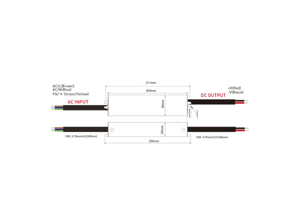 LED napájecí, napěťový zdroj 12 V DC s výkonem 30 W a proudem 2500 mA je vyrobený z hliníku a má rozměry 220 mm x 30 mm x 20 mm. Hmotnost činí 226 g. Napájecí zdroj s označením SELV (bezpečné napětí) má stupeň krytí IP67. Zdroj je opatřeny kabely na vstupu i výstupu. Díky vyššímu stupni krytí IP67 jej lze použít i ve venkovním a vlhkém prostředí.