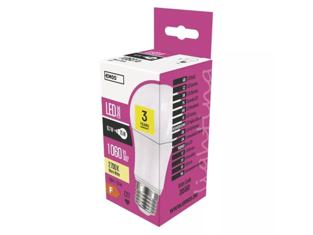 LED žárovka Emos Classic vynikají velmi dobrou svítivostí 1060 lm při nizké spotřebě elektrické energie pouhých 10,7 W. LED žárovkám nevadí časté zapnutí/vypnutí ani nepřetržité svícení. Nabízí tedy minimální spotřebu elektrické energie a bezúdržbový provoz po dobu až 30 000 hodin.