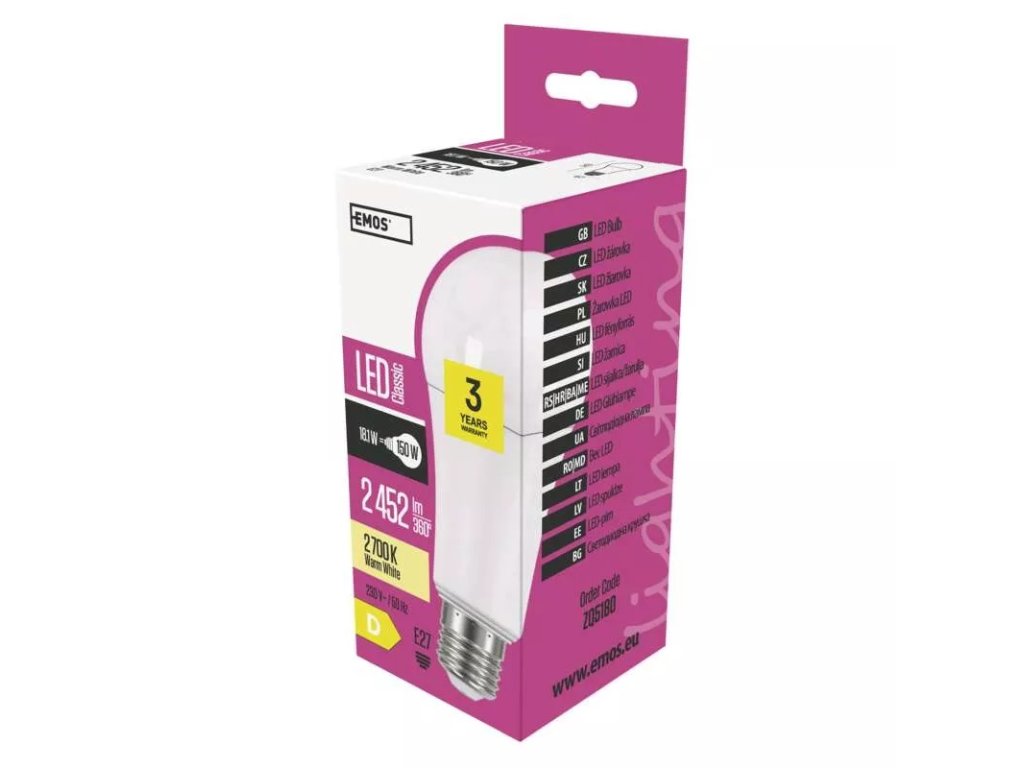 LED žárovka Emos Classic vynikají velmi dobrou svítivostí 2452 lm při nizké spotřebě elektrické energie pouhých 18,1 W. LED žárovkám nevadí časté zapnutí/vypnutí ani nepřetržité svícení. Nabízí tedy minimální spotřebu elektrické energie a bezúdržbový provoz po dobu až 30 000 hodin.