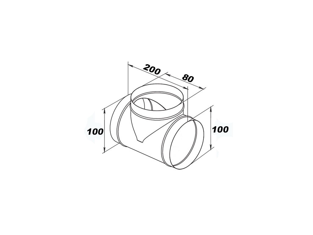T-kus je určen pro přímou instalaci do potrubních součástí stejného průměru. V odbočovacím konci je průměr 80 mm a u zbylých dvou konců je průměr 100 mm. „T“ spojka může být součástí prakticky jakéhokoliv ventilačního systému. Jednoduchá instalace zasunutím do potrubí. T-kus vydrží krátkodobě teplotu až do 100 °C.