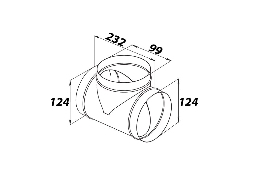 T-kus je určen pro přímou instalaci do potrubních součástí stejného průměru. V odbočovacím konci je průměr 100 mm a u zbylých dvou konců je průměr 125 mm. „T“ spojka může být součástí prakticky jakéhokoliv ventilačního systému. Jednoduchá instalace zasunutím do potrubí. T-kus vydrží krátkodobě teplotu až do 100 °C.