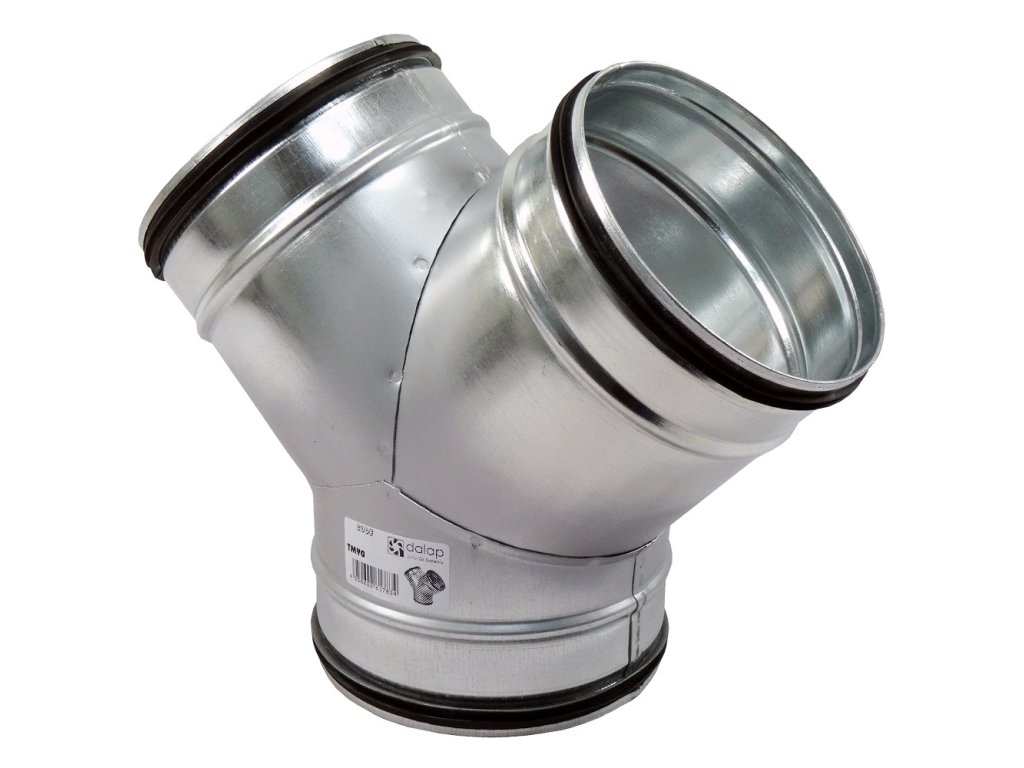 Odbočka ve tvaru „Y“ z pozinkovaného plechu s gumovým těsněním Dalap TMY-O 200 slouží ke spojení a k rozdělení kulatých vzduchotechnických potrubí (například Spiro apod.).