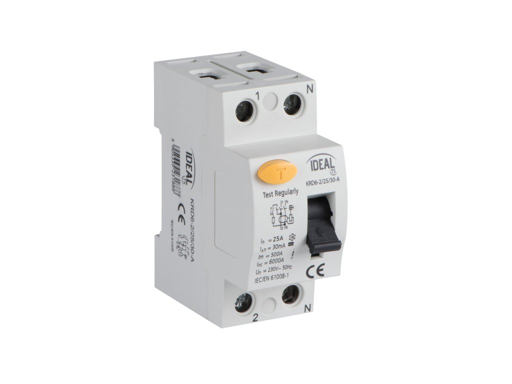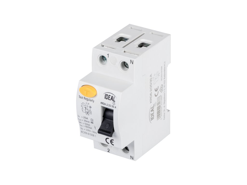 Proudový chránič 25A dvoupólový Kanlux, IDEAL TS KRD6-2/25/30-A slouží k ochraně elektrických obvodů před svodovými proudy a k ochraně osob před úrazem elektrickým proudem.