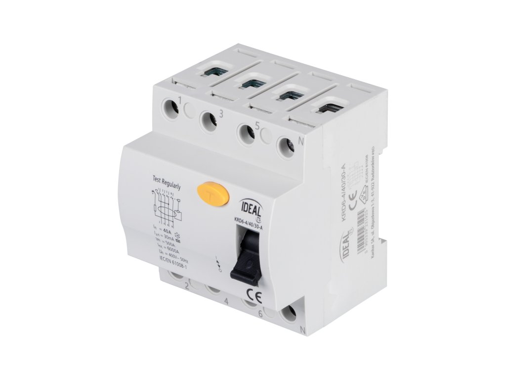 Proudový chránič 40A čtyřpólový Kanlux, IDEAL TS KRD6-4/40/30-A slouží k ochraně elektrických obvodů před svodovými proudy a k ochraně osob před úrazem elektrickým proudem.