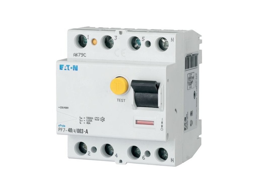 Proudový chránič čtyřpólový od osvědčeného výrobce Eaton pod označením PF7-40/4/003-A – 263611. Proudové chrániče slouží k ochraně elektrických obvodů před svodovými proudy a k ochraně osob před úrazem elektrickým proudem.
