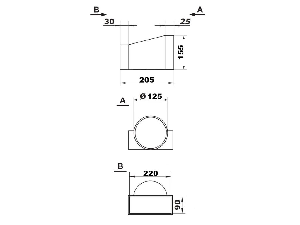 Plastová redukce pro přechod z kruhového vzduchovodu o průměru 125 mm na hranaté ventilační potrubí o rozměru 220x90 mm. Využívá se k napojení potrubí různých průměrů nebo komponentů. Tato redukce se nejvíce využívá k přechodům mezi digestoří a potrubím.