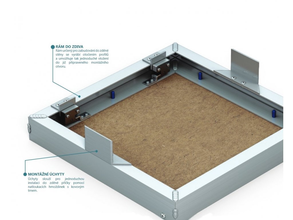 Dvířka jsou již vybavena čelní sádrokartonovou staranou o patřičném rozměru a profilovaným pryžovým těsněním. Z důvodu správného fungování zámků je při montáži potřeba dodržet pravé úhly venkovního rámečku.