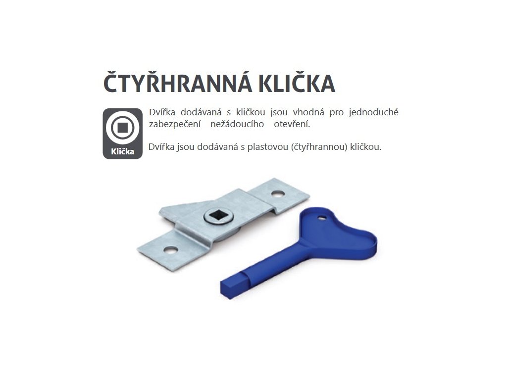 Pantové provedení vnitřního křídla zajišťuje bezpečné otevírání a dostatečný čistý průlez. Vnitřní křídlo je osazeno gumovým těsněním, které při zavřeném stavu dvířek zabraňuje prostupu chladna. Dvířka umožňují rychlý a pohodlný přístup k revizním otvorům bez nutnosti vyjímat celé křídlo dvířek. Otevírání nebo zavírání pomocí čtyřhranného klíče se západkou. Mechanismus funguje tak, že se čtyřhranný klíč zasune do otvoru v křídle dvířek a otočením dojde k odjištění či zajištění západky v rámu.