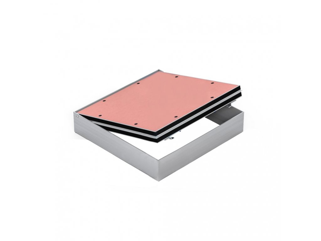 Dvířka jsou vyráběná z hliníkových profilů, vnitřní i vnější rám je spojen svařováním. Kompletní sestava je spojena pomocí pevného pantu a pomocí tlačných zámků lze vnitřní křídlo dvířek v případě potřeby otevřít. Po obvodě vnitřního křídla je osazeno protipožární těsnění, které se při vysoké teplotě mnohonásobně zvětší a zabrání tak průniku ohně. Vnitřní rám je dále osazen gumovým těsněním ,které zabraňuje průniku kouře. Výplň dvířek je tvořena červenou sádrokartonovou deskou 2x 12,5 mm (celkem tedy 25mm), upevněnou pomocí samovrtných šroubů.