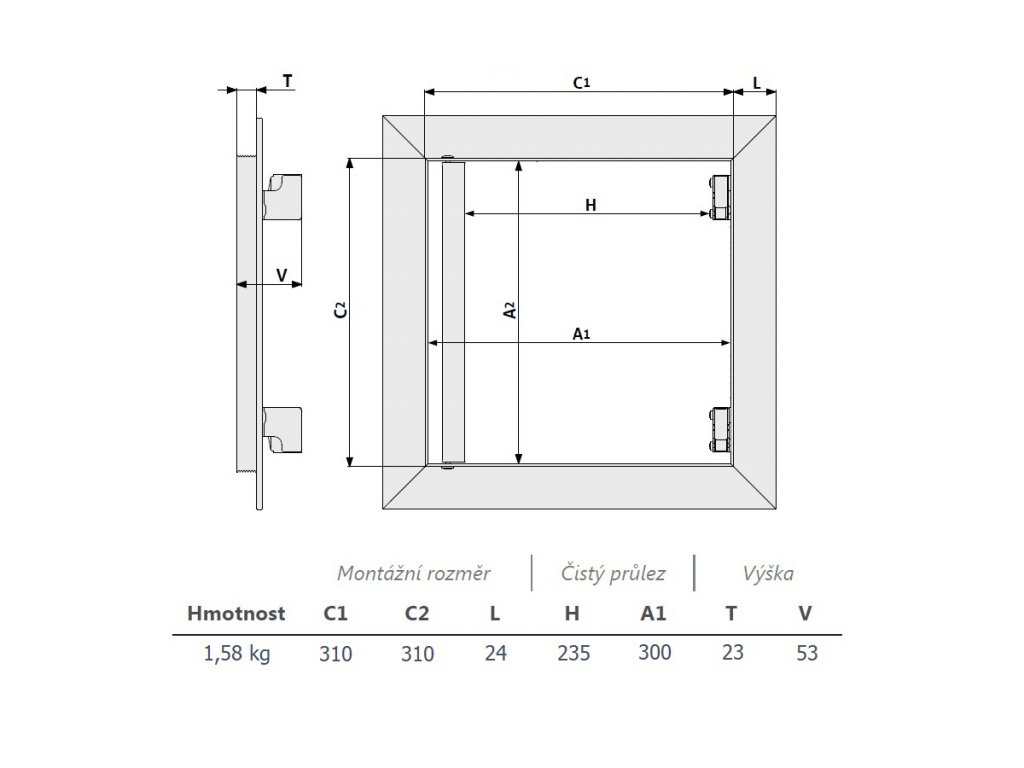 Montáž: Revizní dvířka se připevňují na profily samořeznými vruty. Univerzální upevnění na pravou nebo levnou stranu otvoru. Montáž pouze do sádrokartonové stěny.