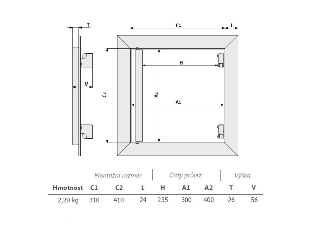 Montáž: Revizní dvířka se připevňují na profily samořeznými vruty. Univerzální upevnění na pravou nebo levnou stranu otvoru. Montáž pouze do sádrokartonové stěny.