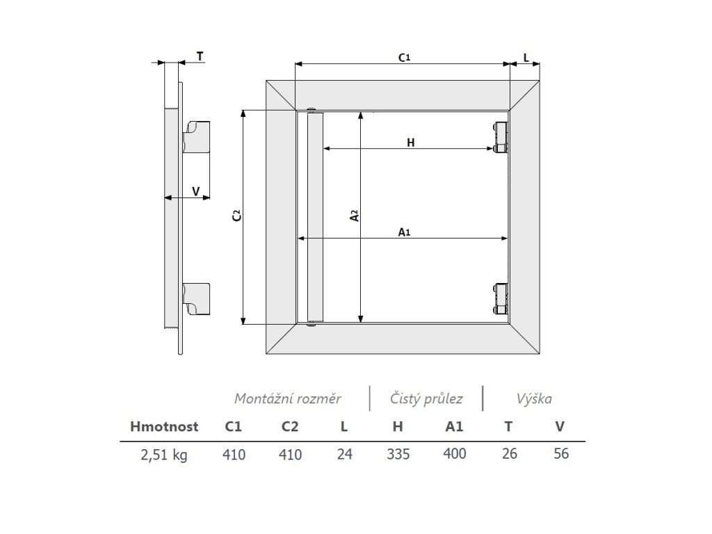 Zpracování: Hlavní nosná konstrukce dvířek a rám jsou vyrobeny z hliníkového profilu osazené impregnovanou sádrokartonovou deskou GKBi o síle 12,5 mm. Možnost použít dvířka jako pravé i levé. Mezi pohyblivým rámem klapky a pevným rámem je viditelná mezera cca 1,5 mm. Pohodlné otevírání a zavírání je zajištěno tlačnými US zámky, které jsou umístěné na venkovním rámu. Zatlačení na desku vnitřního rámu v místě zámku způsobí vycvaknutí či zacvaknutí západky.