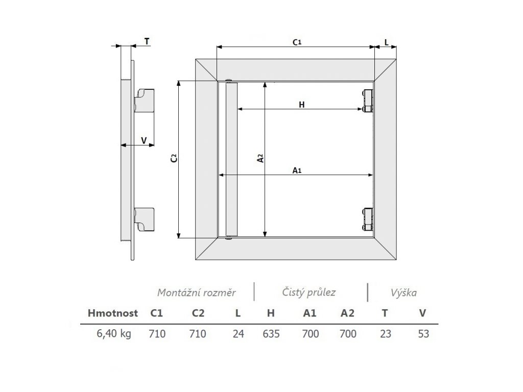 Zpracování: Hlavní nosná konstrukce dvířek a rám jsou vyrobeny z hliníkového profilu osazené impregnovanou sádrokartonovou deskou GKBi o síle 12,5 mm. Možnost použít dvířka jako pravé i levé. Mezi pohyblivým rámem klapky a pevným rámem je viditelná mezera cca 1,5 mm. Pohodlné otevírání a zavírání je zajištěno tlačnými US zámky, které jsou umístěné na venkovním rámu. Zatlačení na desku vnitřního rámu v místě zámku způsobí vycvaknutí či zacvaknutí západky.