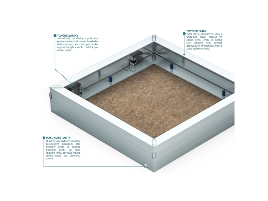 Použití: Revizní dvířka pod obklad jsou určena do zděné stěny. Dvířka umožňují rychlý a pohodlný přístup k revizním otvorům, jako jsou uzávěry vody, plynu, vzduchotechniky atd. Vhodné do místností a prostorů s vysokou vlhkostí, jako jsou koupelny, toalety apod. Mechanismus otevírání, který zajišťuje bezpečné uzavření. Otevírání zatlačením – otevřít a zavřít (tlakový zámek).