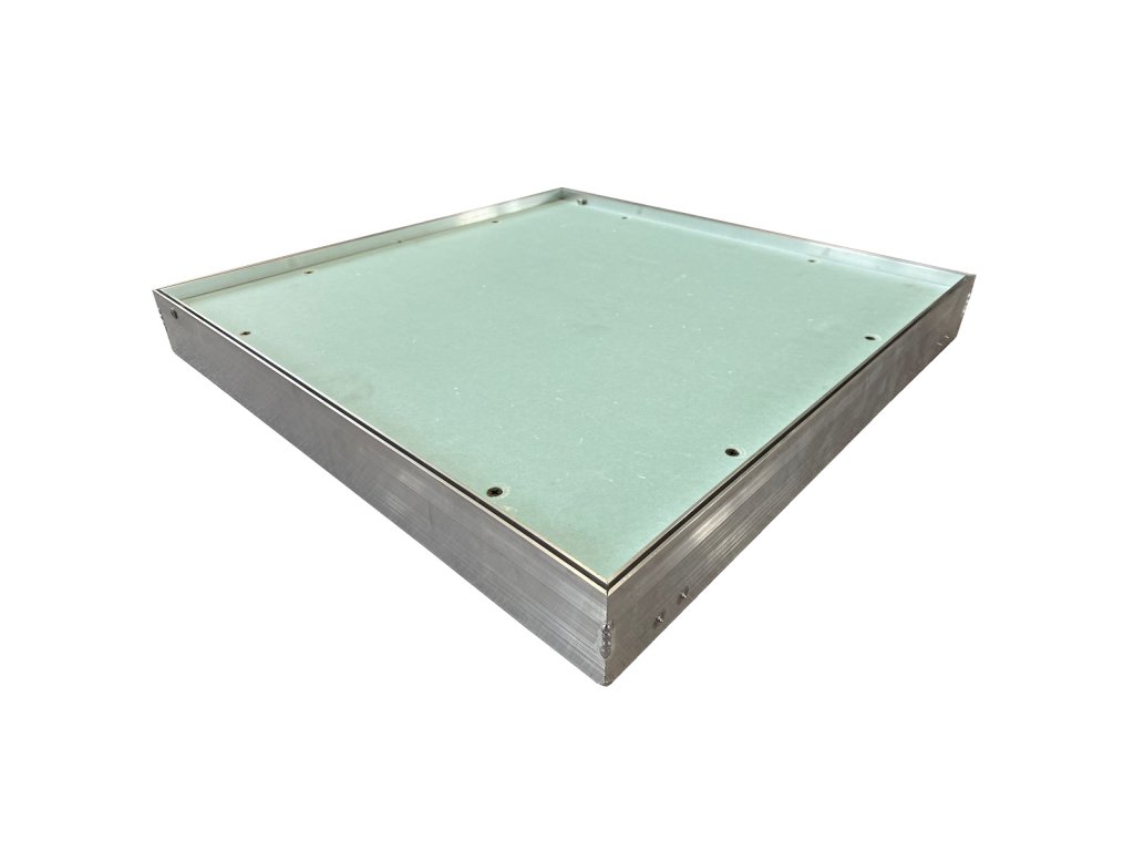 Zpracování: Dvířka jsou vyrobeny z hliníkových profilů, které jsou svařovány do venkovního a vnitřního rámu. Křídlo dvířek je osazené impregnovanou sádrokartonovou deskou GKBi o síle 12,5 mm. Kompletní sestava je spojena pomocí pevného pantu a umožňuje tak otevírání křídla dvířek v případě potřeby. Možnost použít dvířka jako pravé i levé. Mezi pohyblivým rámem klapky a pevným rámem je viditelná mezera cca 1,5 mm. Pohodlné otevírání a zavírání je zajištěno tlačnými US zámky, které jsou umístěné na venkovním rámu. Zatlačení na desku vnitřního rámu v místě zámku způsobí vycvaknutí či zacvaknutí západky.