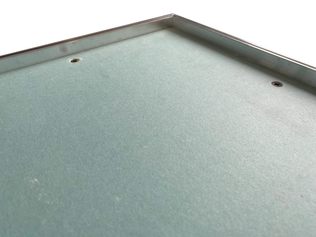 Zpracování: Dvířka jsou vyrobeny z hliníkových profilů, které jsou svařovány do venkovního a vnitřního rámu. Křídlo dvířek je osazené impregnovanou sádrokartonovou deskou GKBi o síle 12,5 mm. Kompletní sestava je spojena pomocí pevného pantu a umožňuje tak otevírání křídla dvířek v případě potřeby. Možnost použít dvířka jako pravé i levé. Mezi pohyblivým rámem klapky a pevným rámem je viditelná mezera cca 1,5 mm. Pohodlné otevírání a zavírání je zajištěno tlačnými US zámky, které jsou umístěné na venkovním rámu. Zatlačení na desku vnitřního rámu v místě zámku způsobí vycvaknutí či zacvaknutí západky.