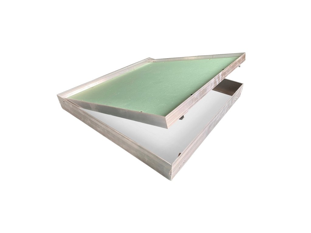 Zpracování: Dvířka jsou vyrobeny z hliníkových profilů, které jsou svařovány do venkovního a vnitřního rámu. Křídlo dvířek je osazené impregnovanou sádrokartonovou deskou GKBi o síle 12,5 mm. Kompletní sestava je spojena pomocí pevného pantu a umožňuje tak otevírání křídla dvířek v případě potřeby. Možnost použít dvířka jako pravé i levé. Mezi pohyblivým rámem klapky a pevným rámem je viditelná mezera cca 1,5 mm. Pohodlné otevírání a zavírání je zajištěno tlačnými US zámky, které jsou umístěné na venkovním rámu. Zatlačení na desku vnitřního rámu v místě zámku způsobí vycvaknutí či zacvaknutí západky.