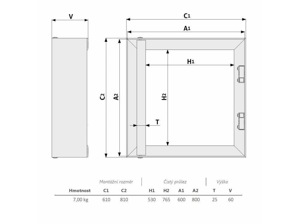 Zpracování: Dvířka jsou vyrobeny z hliníkových profilů, které jsou svařovány do venkovního a vnitřního rámu. Křídlo dvířek je osazené impregnovanou sádrokartonovou deskou GKBi o síle 12,5 mm. Kompletní sestava je spojena pomocí pevného pantu a umožňuje tak otevírání křídla dvířek v případě potřeby. Možnost použít dvířka jako pravé i levé. Mezi pohyblivým rámem klapky a pevným rámem je viditelná mezera cca 1,5 mm. Pohodlné otevírání a zavírání je zajištěno tlačnými US zámky, které jsou umístěné na venkovním rámu. Zatlačení na desku vnitřního rámu v místě zámku způsobí vycvaknutí či zacvaknutí západky.
