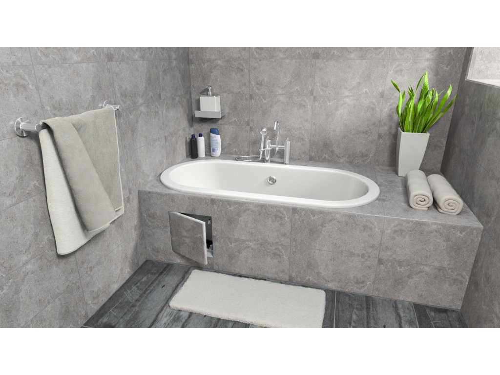 Dvířka jsou již vybavena čelní sádrokartonovou deskou o patřičném rozměru. Obklad není součástí.