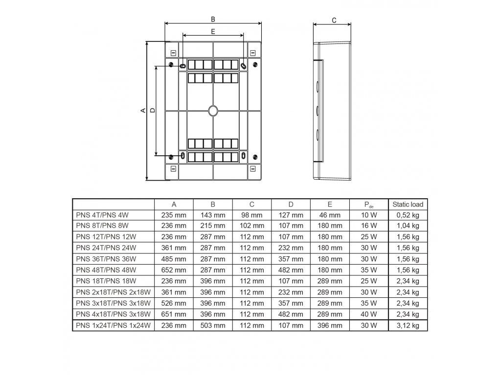 Plastová rozvodnice PNS je určena zejména pro domovní a všeobecné aplikace. Design rozvaděče je vhodný pro povrchovou - nástěnnou montáž. Elektrický rozvaděč je možné osadit až 12 moduly (jističe, chrániče, stykače apod.) v jedné řadě.