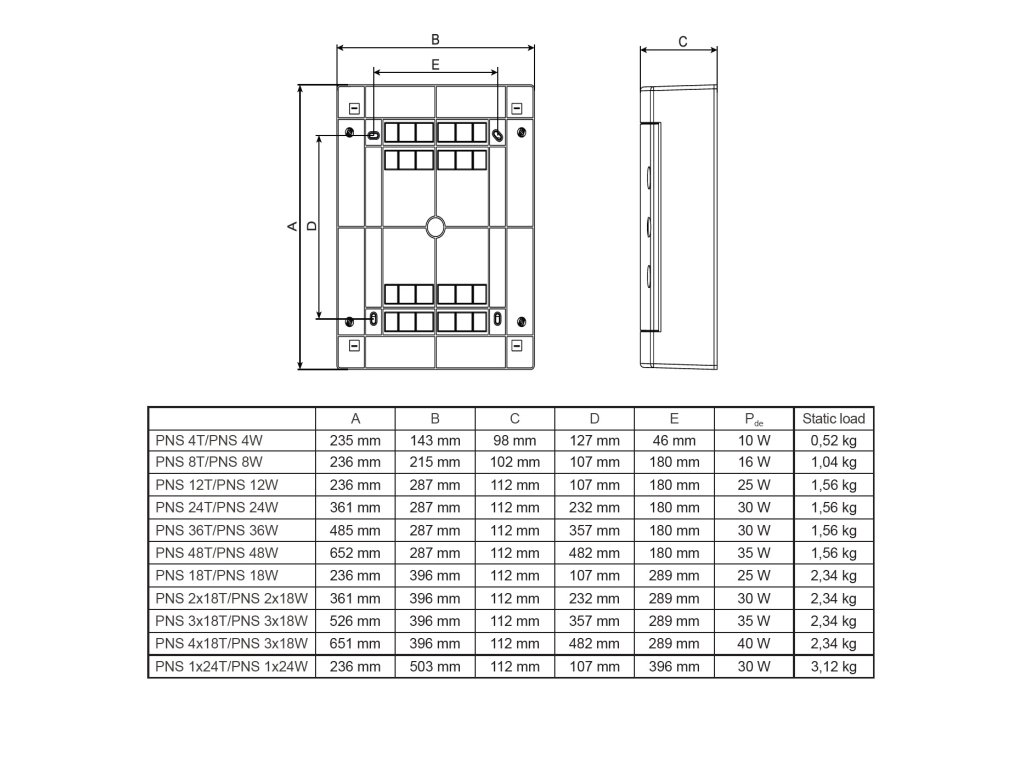 Plastová rozvodnice PNS je určena zejména pro domovní a všeobecné aplikace. Design rozvaděče je vhodný pro povrchovou - nástěnnou montáž. Elektrický rozvaděč je možné osadit až 48 moduly (jističe, chrániče, stykače apod.) ve třech řadách.