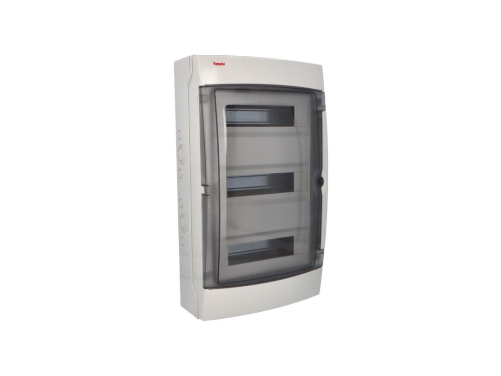 Plastová rozvodná skříň Acqua 3942-TTB ve vyšším krytí IP65 s průhledným okénkem a s modulovým prostorem pro 42 modulů ve třech řadách k osazení jističů, chráničů apod. Rozvodnice je vhodná pro obecné i průmyslové aplikace, ve kterých je požadován vysoký stupeň krytí IP - rozvodnice s krytím IP65. Provedení rozvodnice je přizpůsobeno k povrchové montáži.