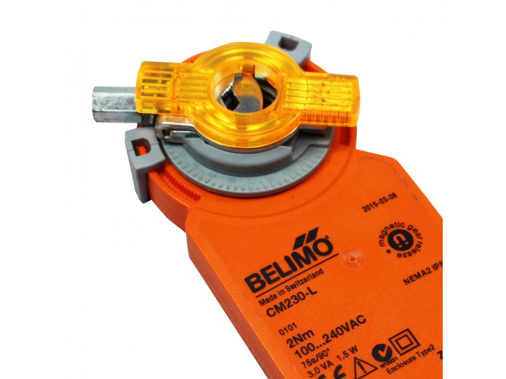 Belimo CM230 je servopohon určený pro zpětné klapky Dalap KTP, které se instalují ve vzduchotechnických rozvodech. Kroutící moment (ovládací moment) pohonu je 2 NM. Servopohon se instaluje přímo na osu (hřídel) zpětné klapky a upevní se speciální svorkou, která zabraňuje přetočení (prokluzu).