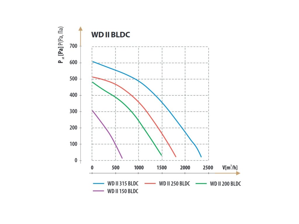 Střešní ventilátor je osazen radiálním oběžným kolem (vrtulí), která je vyvážena staticky i dynamicky a nasazena na motor. Směr otáčení není možné měnit. Jednofázový asynchronní motor s vnějším rotorem a tepelnou pojistkou. Motor má kvalitní dvouřadá kuličková ložiska značky SKF a stálou tukovou náplň pro celou dobu životnosti až 120 000 hodin. Třída izolace I a krytí IP X4. Rozměry střešního ventilátoru WD II 150 naleznete na přiloženém obrátku.