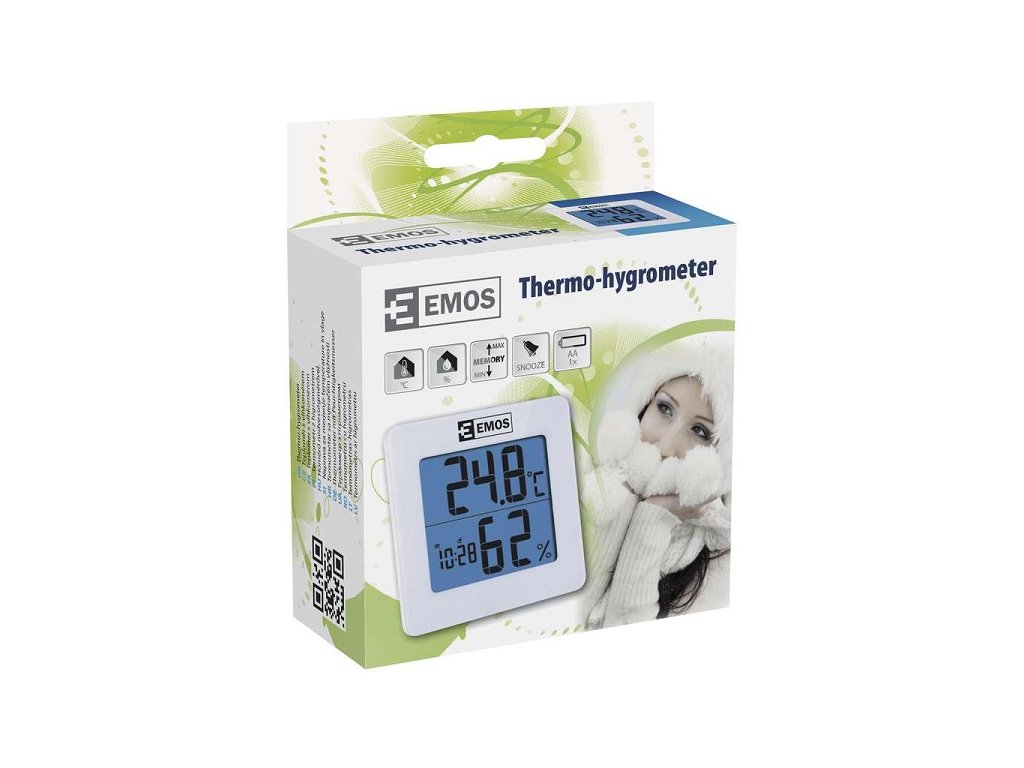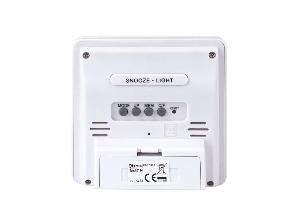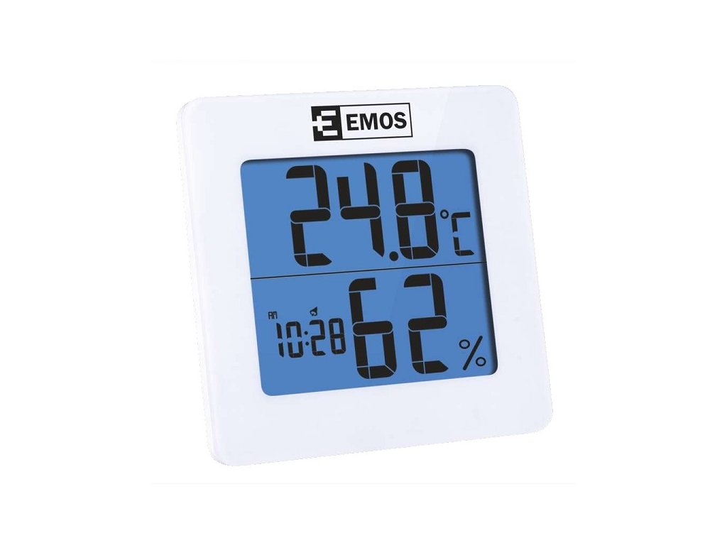 Digitální teploměr s vlhkoměrem EMOS T0114 zobrazující hodiny, datum, údaj o vnitřní teplotě a vlhkosti.