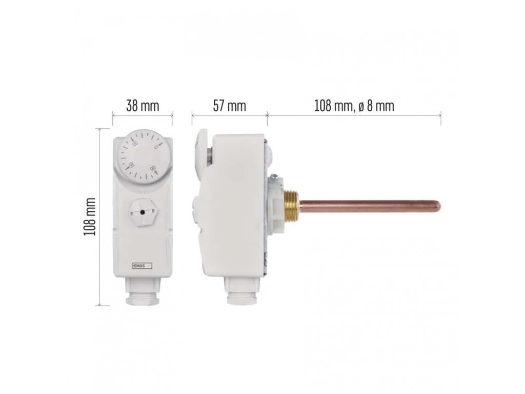 Manuální ovládání jímkového termostatu je naprosto jednoduché a intuitivní. Stačí jednoduše otočit jediným kolečkem a nastavit požadovanou teplotu. S jeho kompaktními rozměry, 1/2 závitem a délkou čidla 110 mm, je instalace snadná a bezproblémová.