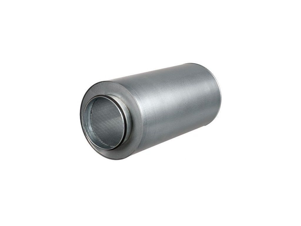 Popis : Kruhový tlumič se používá pro snížení hluku šířeného potrubím. Konstrukčně je řešen dvěma soustřednými válci s výplní protihlukovou izolací. Vnitřní plášť tlumiče je perforovaný, na koncích je opatřen nástavci pro montáž do kruhového potrubí. Pro vyšší těsnost spoje s potrubím jsou nástavce na obou koncích opatřeny drážkou s gumovým těsněním tvaru T. Jmenovité průměry odpovídají rozměrům dle DIN 24145, typová řada včetně útlumů hluku v oktávových pásmech viz tabulka v katalogovém listu. Tento tlumič umožňuje snížení hluku až o cca 20dB.