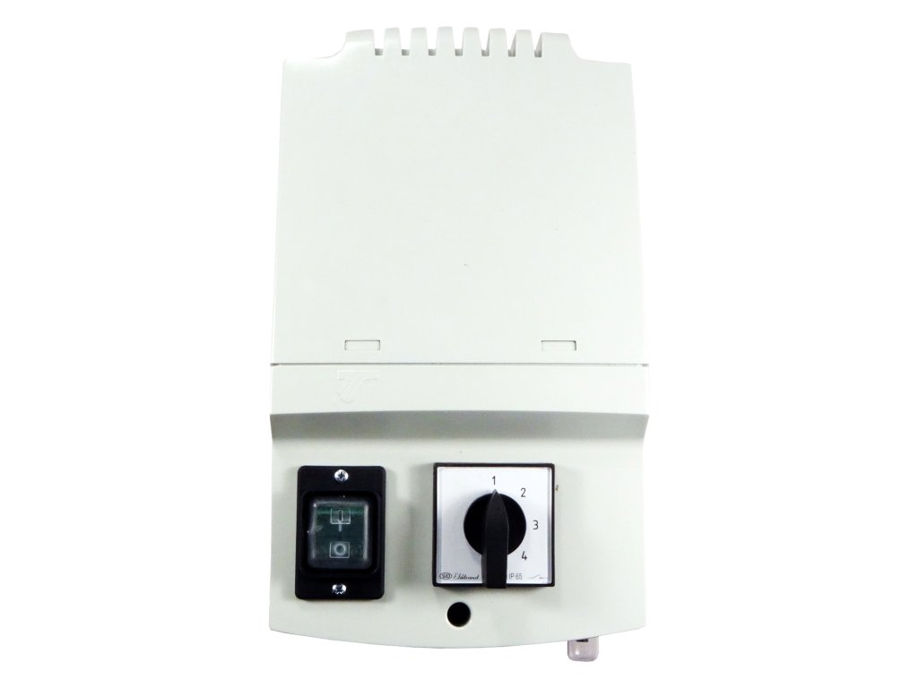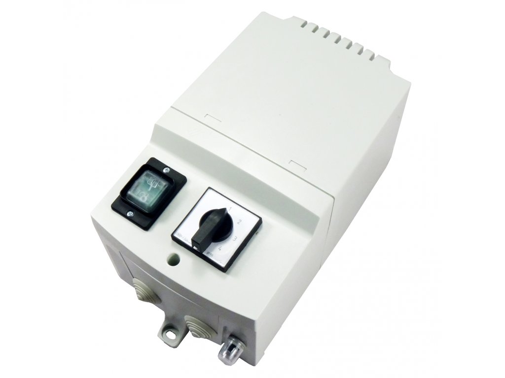 Jednofázový transformátorový regulátor otáček vhodný pro jednofázové motory ventilátorů řízených jmenovitým proudem 14,0 A. Svým využitím je předurčen pro montáž v průmyslových ventilačních systémech nebo topných zařízení. Regulátor otáček je vybaven pětistupňovou regulací pomocí kolečka, které je umístěno na předním panelu zařízení. Dále je vybaven samostatným tlačítkem pro světelnou signalizaci zapojení.