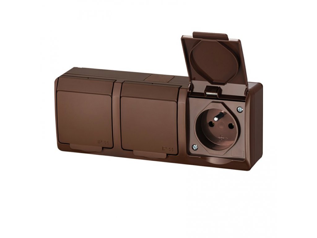 Venkovní trojitá zásuvka s víčkem IP44 Galatea hnědá, na zeď