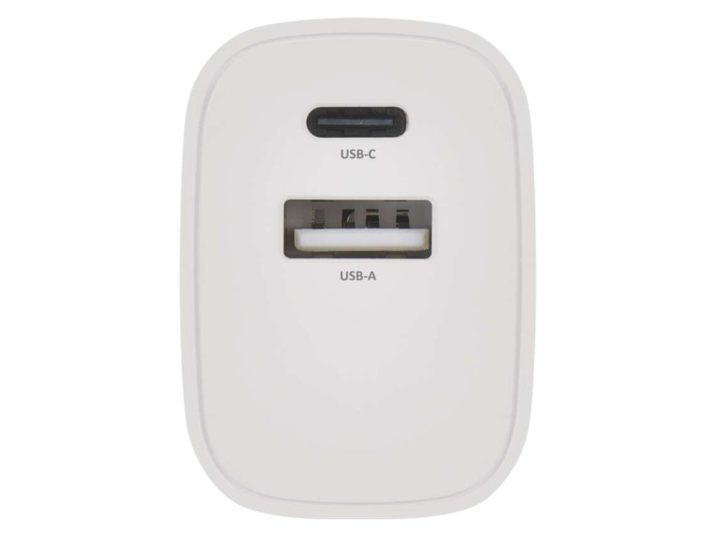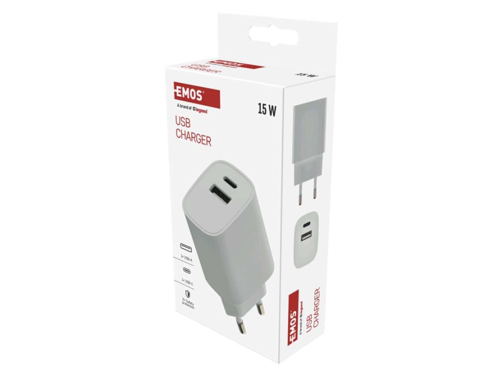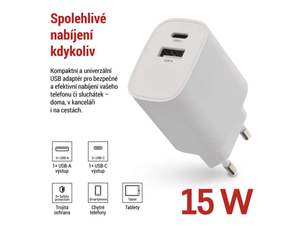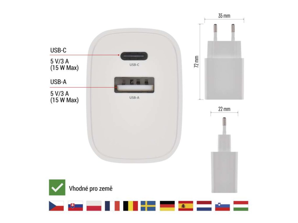 univerzální adaptér USB-A + USB-C, USB nabíječka V02B15, bílá, 15W