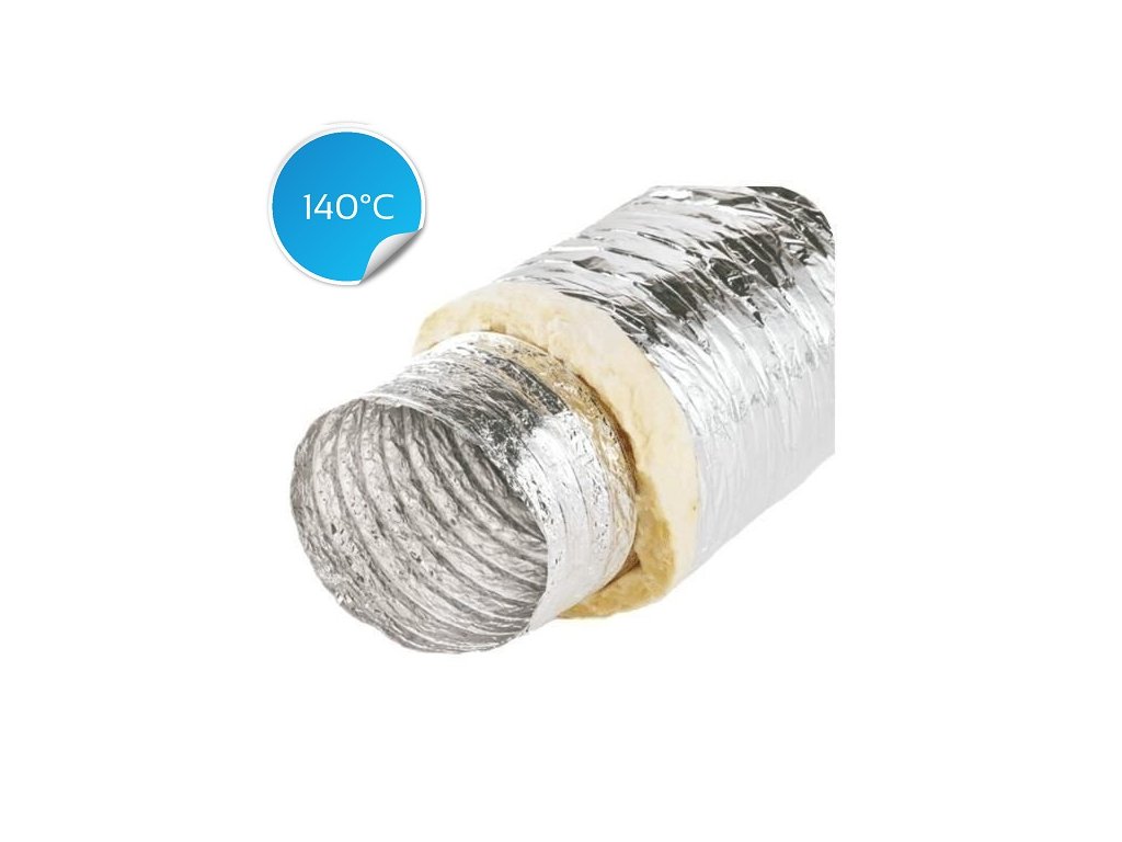 Vyrobena s TEPELNOU IZOLACÍ 25mm. Výrobek se skládá z vnitřní ohebné hadice konstrukce jako EURO AL, která je obalena minerální vatou a vnější vrstvu tvoří ohebný hliníkový, velmi odolný návlek. -30°C až 140°C. Max tlak 2.500 Pa, max.rychlost vzduchu : 30 m/s.