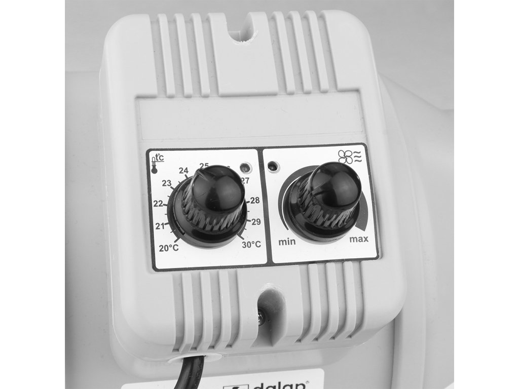 Ventilátor má na svém těle integrovaný elektronický modul s regulátorem otáček a teplotním čidlem, který umožňuje automatickou regulaci otáček v závislosti na teplotě vzduchu ve ventilačním potrubí. Teplotu a minimální rychlost nastavíte ovládacími knoflíky na panelu regulátoru. LED indikátor pro provoz termostatu je umístěný na předním panelu ventilátoru.