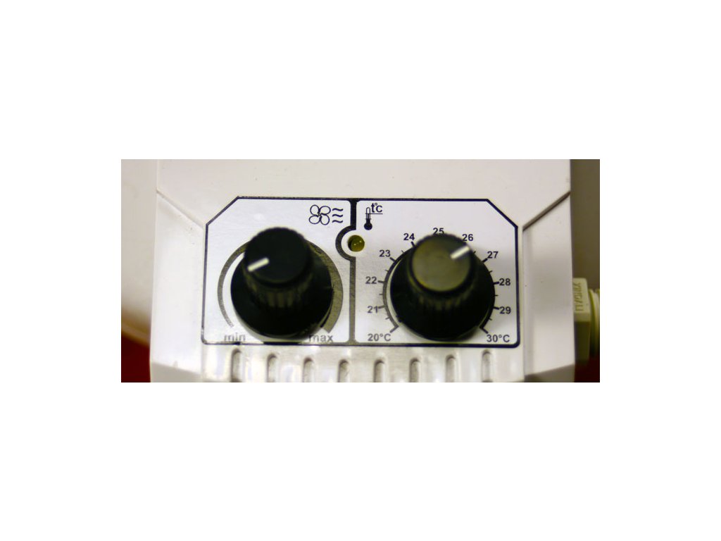 Ventilátor je vybaven integrovaným elektronickým modulem otáček a teplotním čidlem, který umožňuje automatickou regulaci otáček v závislosti na teplotě vzduchu v potrubí. Teplota a minimální rychlost může být nastavena ovládacími knoflíky na panelu regulátoru. LED indikátor pro provoz termostatu je umístěn na předním panelu ventilátoru. Viz foto.