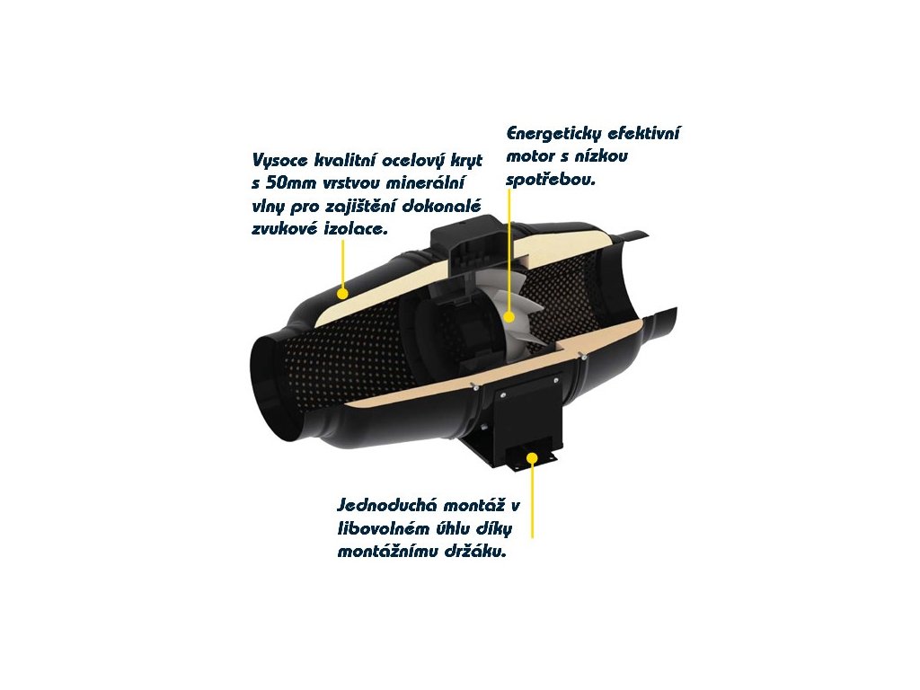 Provedení: Kryt ventilátoru je vyroben z kvalitní oceli a jeho tvar zajišťuje vysokou aerodynamiku. Vnitřní část ventilátoru je izolována vrstvou minerální vlny (50 mm), která zajišťuje dokonalou zvukovou izolaci. Motor s oběžným kolem a svorkovnice jsou upevněny na těle ventilátoru pomocí šroubů, které zajišťují tichý chod bez vibrací. Speciálně tvarované lopatky oběžného kola zvyšují rychlost proudění vzduchu a poskytují tak vyšší tlak a kapacitu. Ventilátor disponuje externí elektrickou montážní karbičkou pro snadnější připojení k el. rozvodu. Krytí IPX4.