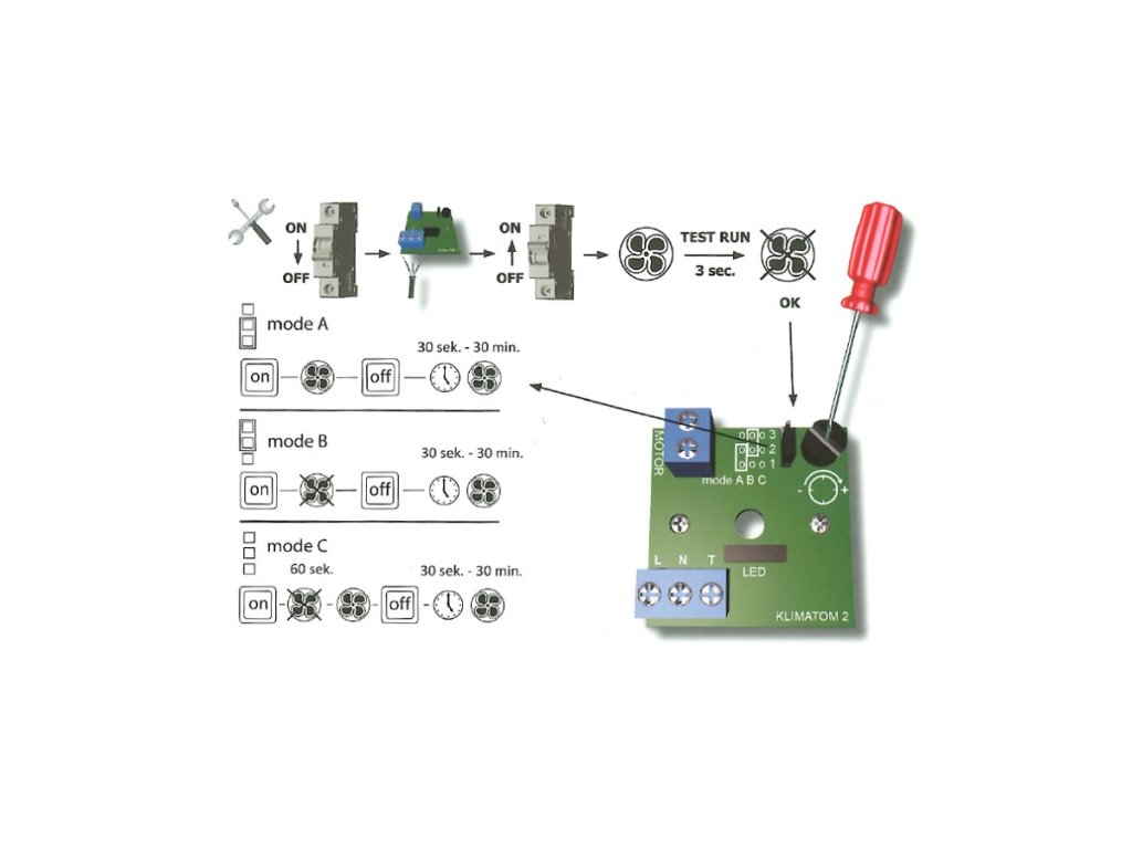 Mod C – Ventilátor startuje se zpožděním cca 1 minuty (přivedení napětí na svorku T) a po vypnutí vypínače (na svorce T není žádné napětí) ventilátor ještě pracuje po nastavený čas doběhu. V tomto nastavení, jestli dojde k vypnutí napájecího napětí na svorku T dříve než za 1 minutu, ventilátor nezačne pracovat.