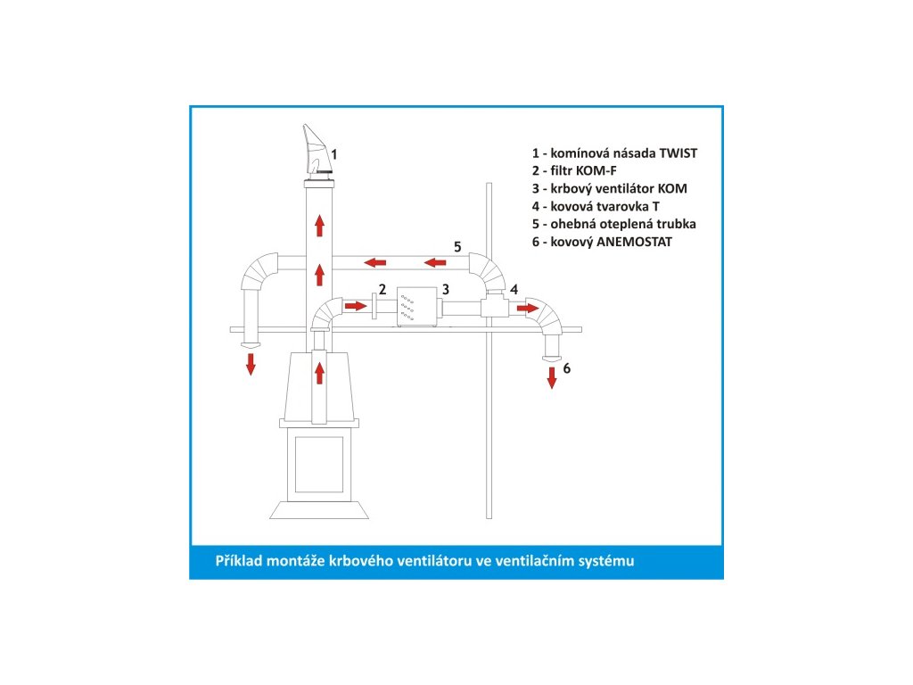 Montáž: Ventilátor má přívodní kabel s běžnou zástrčku do zásuvky na 230V a jeho zapojení je tak velice snadné a rychlé. Samotný ventilátor je možné provozovat do teploty 150°C a proto je možné, umístit ventilátor cca 1 metr od zdroje tepla. Před ventilátor doporučujeme instalovat filtr nečistot. Ten zachytí nečistoty, které by mohly ventilátor poškodit.
