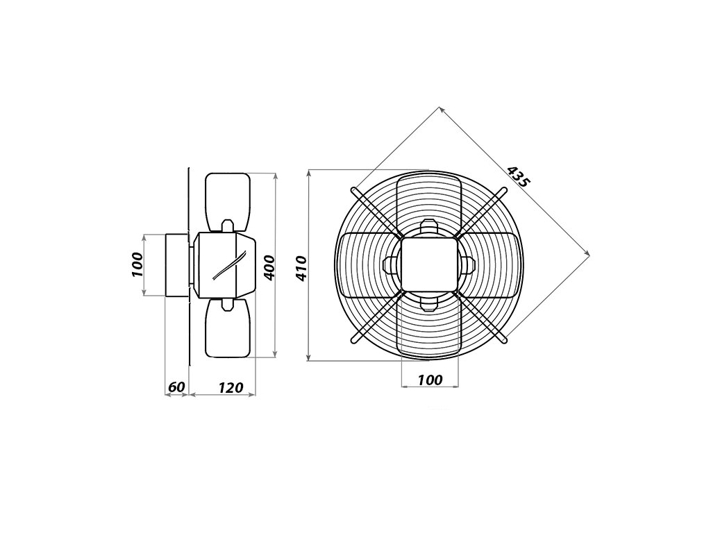 Ventilátor je osazen jednofázovým asynchronním motorem s rozběhovým kondenzátorem a s krytím IP X4 a tepelnou pojistkou proti přehřátí. Ochranná kovová krycí mřížka chrání vrtuly před poškozením. Kuličková ložiska zajišťují dlouho živostnost a montáž v jakékoliv poloze. Svorkovnice pro přípojení je součástí ventilátora a je umístěna na středu ochranné mřížky.